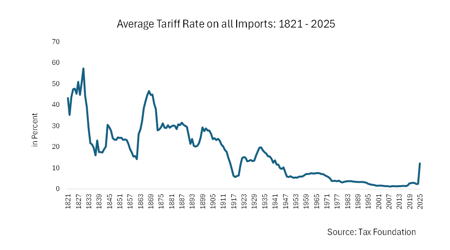 Reagan’s opposition to tariffs was not merely words either. His position on tariffs can be clearly seen in the evidence. Based on data from the Tax Foundation, the below chart presents the average tariff rate on all imports into the U.S. between 1821 and 2025.