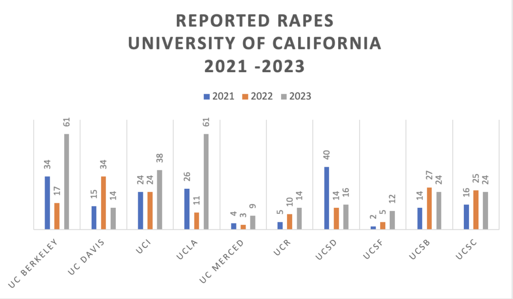 - UC Berkeley and UCLA each reported 61 rapes in 2023. When adjusted for student population, this equates to rates of 184.5 per 100,000 students at UC Berkeley and 164 per 100,000 at UCLA—approximately four to six times the statewide reported rate.